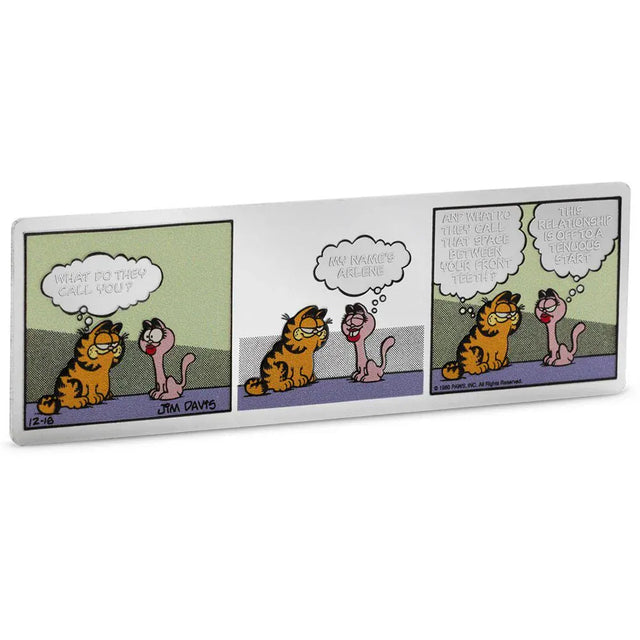 This officially licensed 1oz 999 pure silver collectible recreates the memorable 1980 three-panel strip featuring Garfield and Arlene in full colour. The front features the original 1980 three-panel comic strip where Garfield and Arlene share a witty exchange full of vintage Garfield charm.