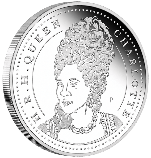 The coin portrays an illustrated portrait of Queen Charlotte, accompanied by the inscription “H.R.H QUEEN CHARLOTTE”, encircled by a ring of stylised dots. The design is reminiscent of coinage from the Regency-era and includes The Perth Mint’s ‘P’ mintmark.